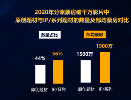 从2020年分账票房破千万影片原创题材与IP系列题材的数量票房对比可以看出,上半年IP/系列作品优势依旧,部均票房达到1900万,展现出这类作品强大的市场价值。同时,原创题材发展潜力巨大,在整个的数量占比中,已经达到了44%。