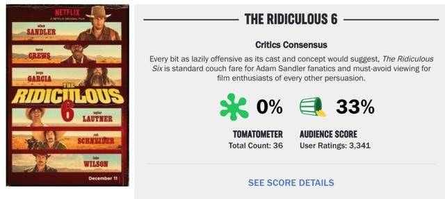 2015年,作为Netflix出品的首部商业片,由亚当·桑德勒主演的西部片《荒唐六蛟龙》投资6000万美元,最终却获得了一个烂番茄0%的评价,成为史上最烂影片之一。但这也并不是Netflix烂片的独苗,大明星、中等投资、烂番茄个位数的烂片,Netflix几乎每一年都有好几部。这种品控能力即便是对于近几年日薄西山的派拉蒙来说也望尘莫及。
