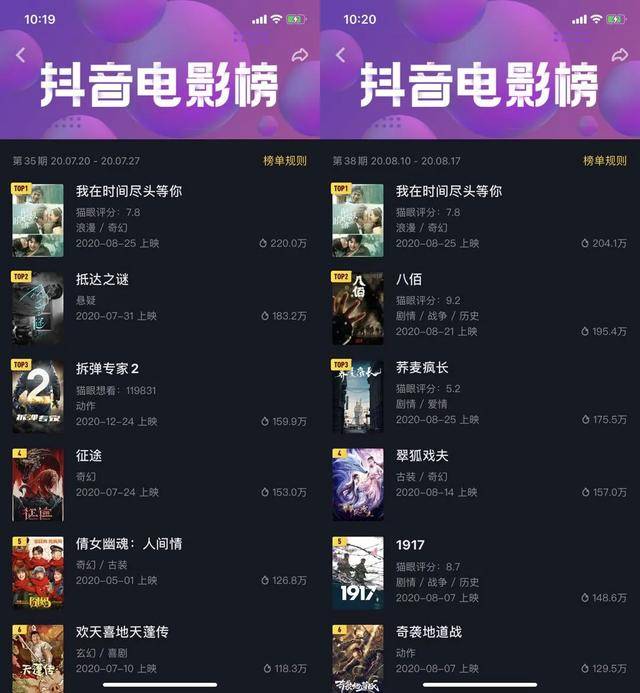 何弭表示,“这次整个短视频的投放量,基本上是同等体量影片的4倍左右。”也是得益于短视频物料的及时放出,在影片宣布定档的当周,《我在时间尽头等你》就开始霸榜抖音电影榜首位,一直持续到《八佰》上映。