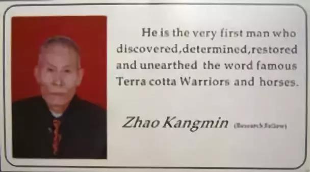 赵康民的英文名片:发现、鉴定、修复、挖掘兵马俑第一人。
