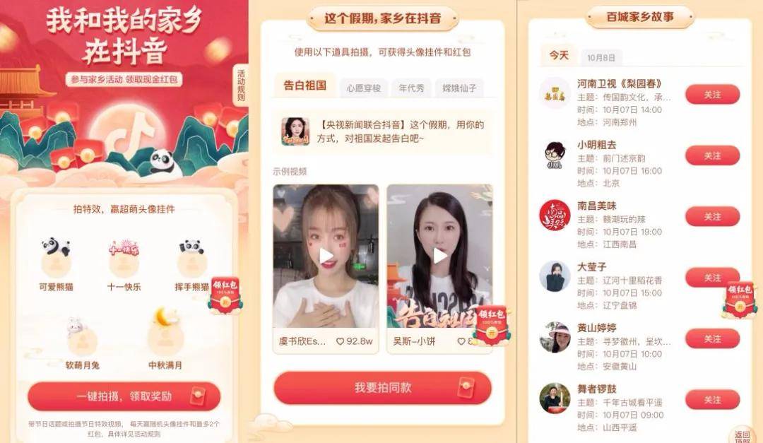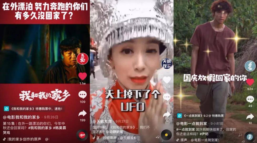 节日话题本身就是电影宣发可直接利用的契机。《我和我的家乡》就于十一前夕开展了“我和我的家乡在抖音”“参与家乡活动,领取现金红包”的活动,号召大批短视频达人、用户进行UGC内容的二次创作、二次传播。