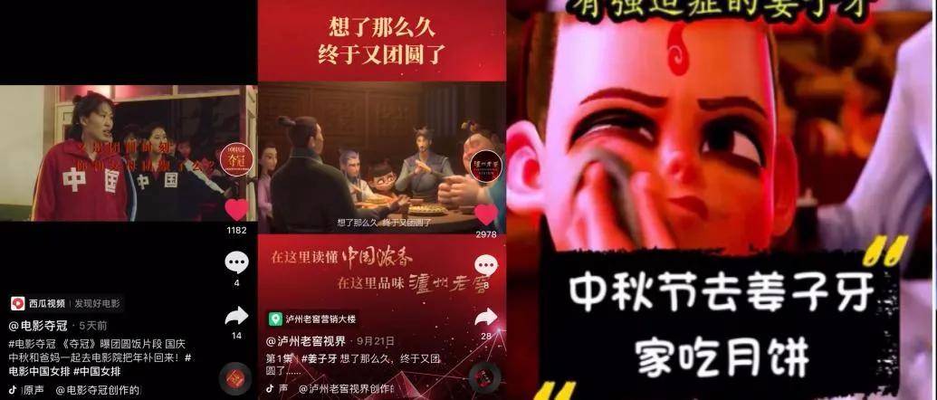 电影《姜子牙》也不甘示弱,片方与泸州老窖特曲在抖音上牵手品牌合作,释放出一段姜子牙和哪吒一伙人团聚喝酒的搞笑剧情彩蛋,传达“想了那么久,终于又团圆了”的情绪。