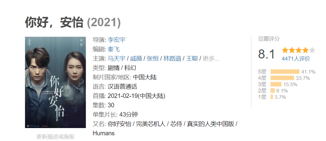 比较难得的是相较于其他国产科幻题材剧,《你好,安怡》的口碑目前算得上不错。虽然比起原作《真实的人类》有不足,但这次国产翻拍并没有对科幻题材蜻蜓点水,而是继承了原作的许多硬核科幻要素,同时进行了较为合理的本土化,剧情节奏和演员表演也基本在线。《你好,安怡》的豆瓣评分开分达到8分以上,虽然热度不算高,但从题材创新角度称得上一个不错的开始。