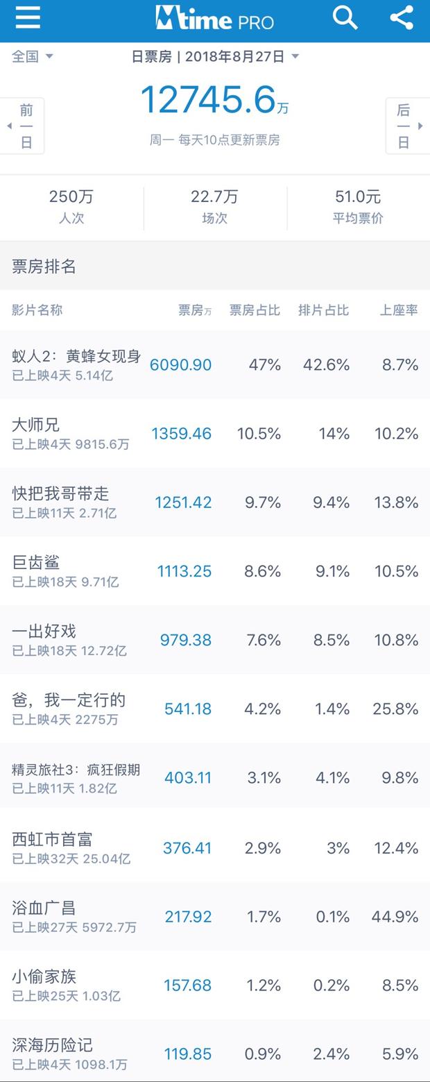 难得没有扑的中美合拍片《巨齿鲨》周一票房进账1113万,预计将在本周突破10亿大关。《一出好戏》昨天新增票房979万,累计票房12.72亿。