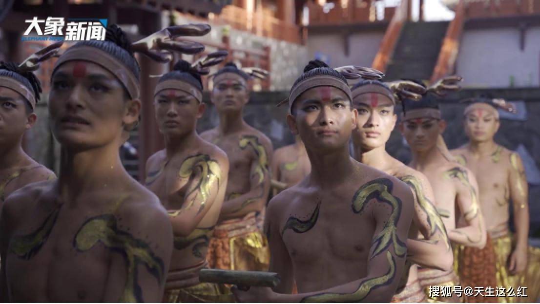 四十位精干少年,赤裸上身,跳起阳刚的祭祀舞蹈,他们舞动船桨,鼓乐齐鸣,身上古朴的龙纹象征着不屈的进取。