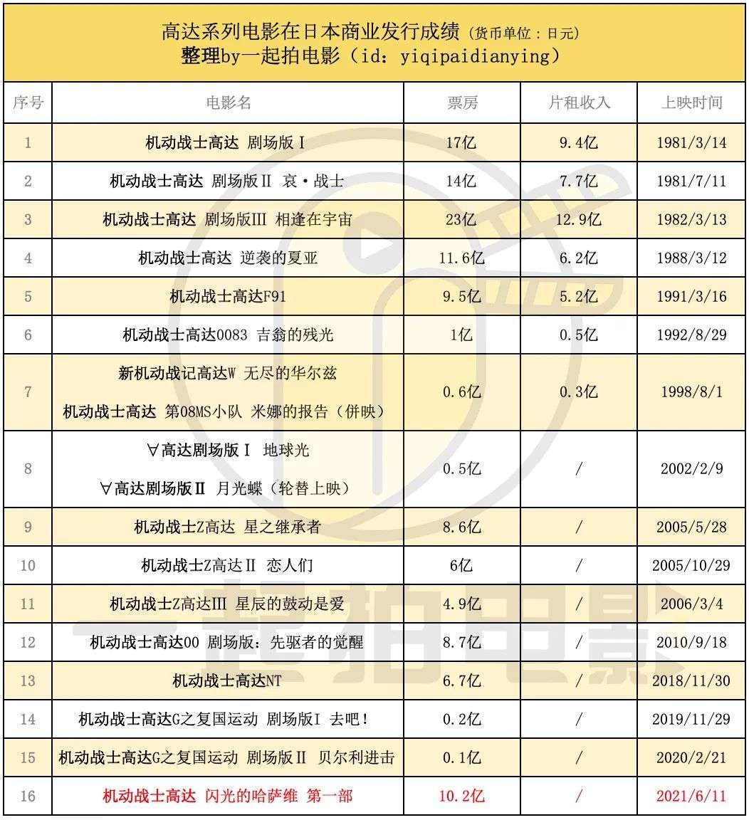 作为动画届的御三家,国民动画高达系列早期在日本票房表现相当不俗,系列首部作品就位居动漫作品影史第三,次年的系列第三部更是有12亿9046万日元的配给收入打入本土片年度前十。不过后期电影作品定位更偏向于OVA,主要为了推销模型和贩卖碟片,影片观影门槛较高粉丝向明显使得票房相对一般。如2018年的U.C宇宙观《机动战士高达NT》,不是资深高达粉丝几乎搞不懂人物和势力关系,而其作为第一部引进内地的高达影片最终也只有871万人民币惨淡票房。