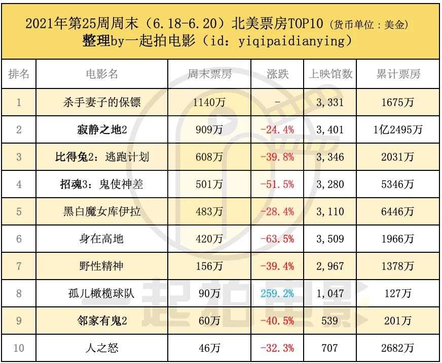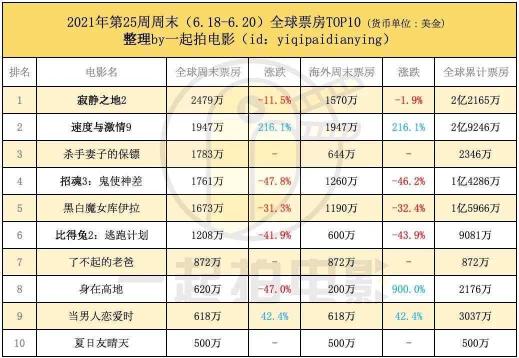 全球方面,《寂静之地2》继续保持连冠,海外同期领先前作达15%,北美则稍微落后16%,整体趋势依然保持稳定,而同类片《招魂3:鬼使神差》似乎受市场挤压原因表现略低于预期。《黑白魔女库伊拉》口碑继续发酵,跌幅仅有32%,在英国和西班牙的跌幅更是低于10%。