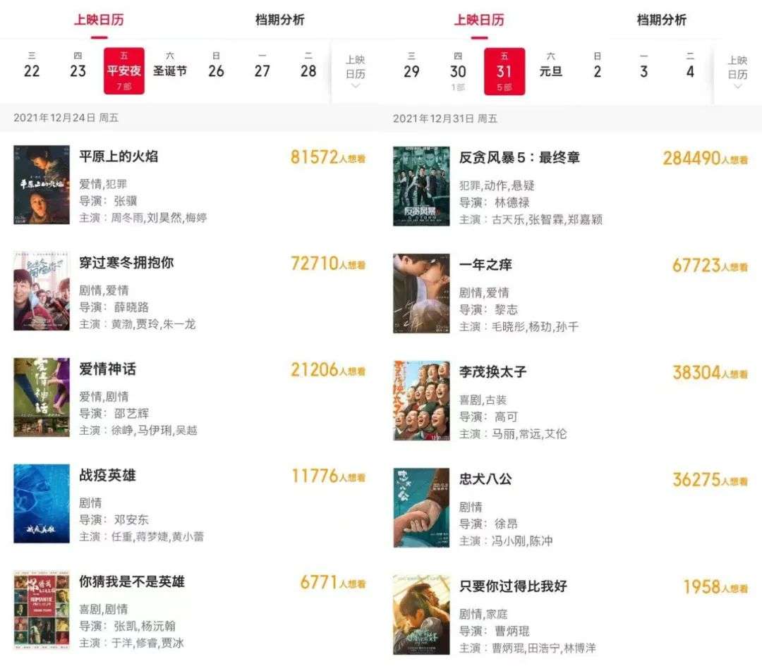 临近跨年之际,定档项目竞争力明显增强,份额之战也将更加激烈。将于12月24日公映的黄渤、贾玲领衔电影《穿过寒冬拥抱你》,以疫情期间的武汉为背景,讲述了冬日中的温暖故事。徐峥和马伊琍主演的《爱情神话》则打出“爱情哲学新标杆”标签,打造不一样的爱情片。