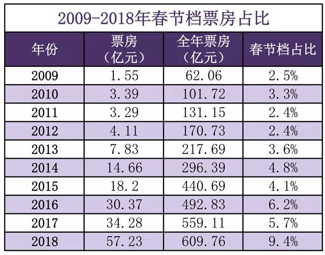 时间倒回到 10 年前,这一数据是—— 2009 年春节档票房 1.55 亿,占全年票房 2.5%。