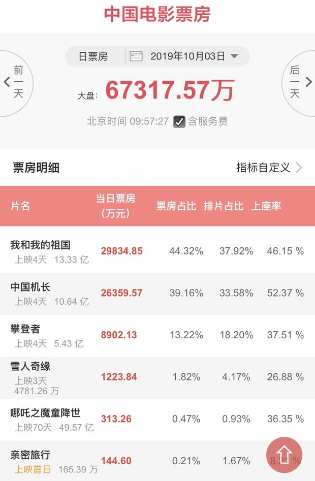 10月3日中国内地影市大盘报收6.73亿,2019年全国累计票房突破500亿大关,用时276天历年最快,相比去年的10月4日提前一天。国庆档三部主旋律电影《我和我的祖国》、《中国机长》和《攀登者》仍旧稳守单日票房三甲,票房总和逼近30亿,刷新了历年国庆档票房最高纪录。