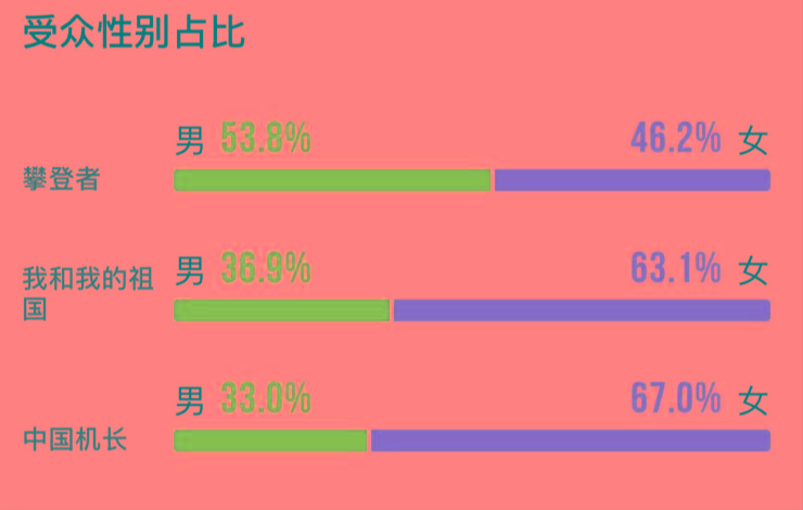 昨日《攀登者》的上座率也是三片中最低的。《祖国》上座率达到了45.7%,《中国机长》上座率38.6%,《攀登者》上座率则只有23.4%,相同场次下上座率几乎只有《祖国》的一半。从用户画像上来看,《攀登者》的受众年龄层略窄于其他两片,24岁以下及35岁以上观众占比都少于其他两部影片;影片女性观众占比则只有46.2%,远远低于其他两片超过60%的数据。