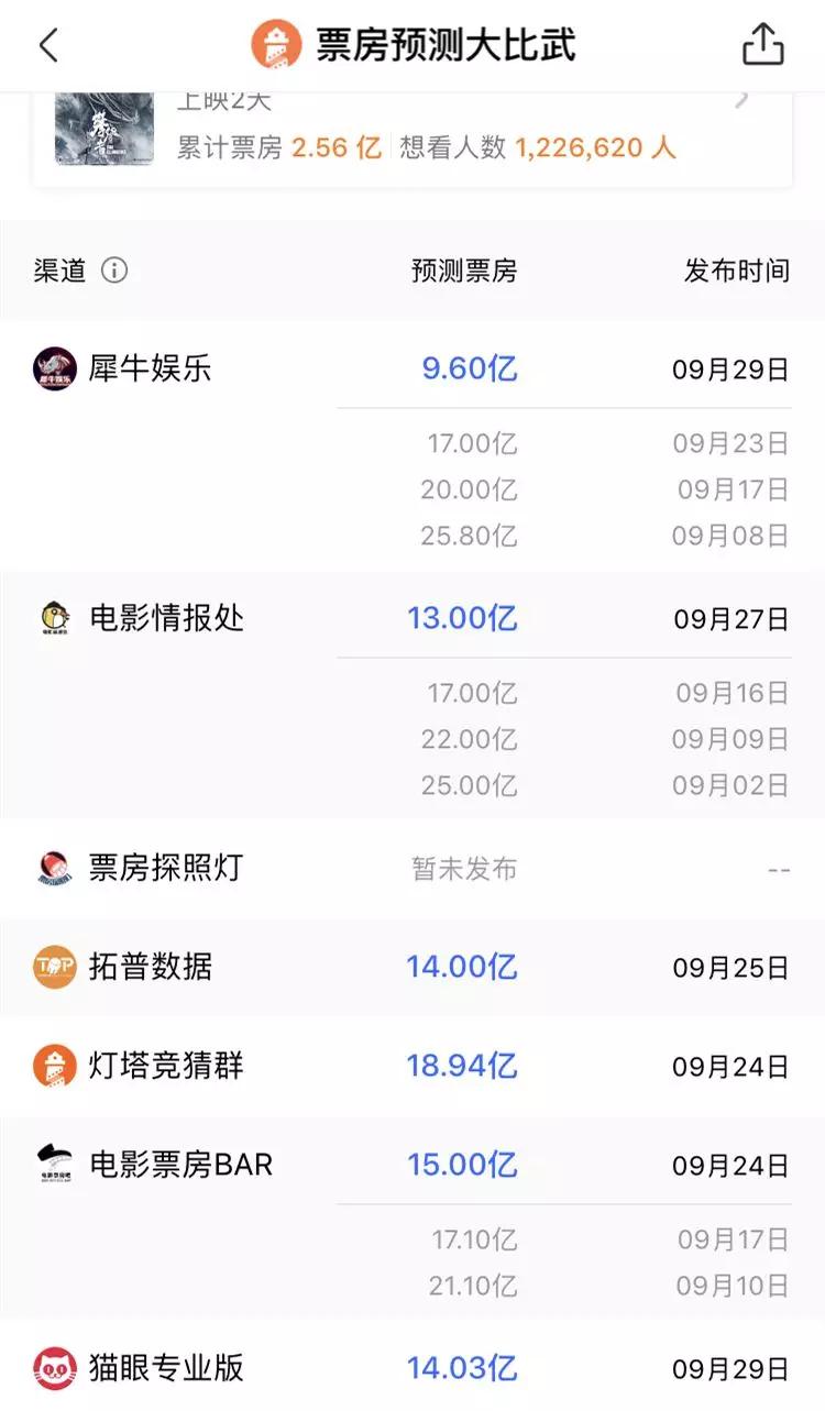 对于《攀登者》的票房预期还可能进一步下调。灯塔的“票房预测大比武”显示,早在上映之前,多家机构与媒体就不断下调《攀登者》的票房预期,多数落在13~15亿的区间。猫眼专业版在上映前对影片的票房预测为14.03亿,而昨日之后票房预测变为13.85亿,随着今日影片排片的大幅下滑,猫眼对其票房预测或许还会下跌。