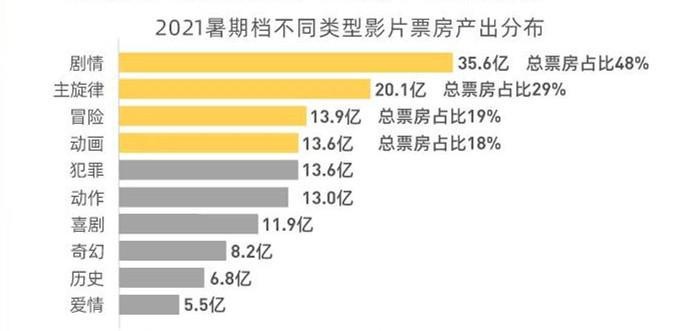 在暑期档期间上映的不同类型影片中,“剧情类”电影票房产出最高,贡献总票房35.6亿,占据总票房的48%;主旋律电影的贡献排名紧随其后,以20.1亿总票房占到总票房的29%。爱情电影在暑期档表现平平,只收获了5.5亿的票房。动画电影类型中,《白蛇传2:青蛇劫起》表现优异,贡献了18%的票房。