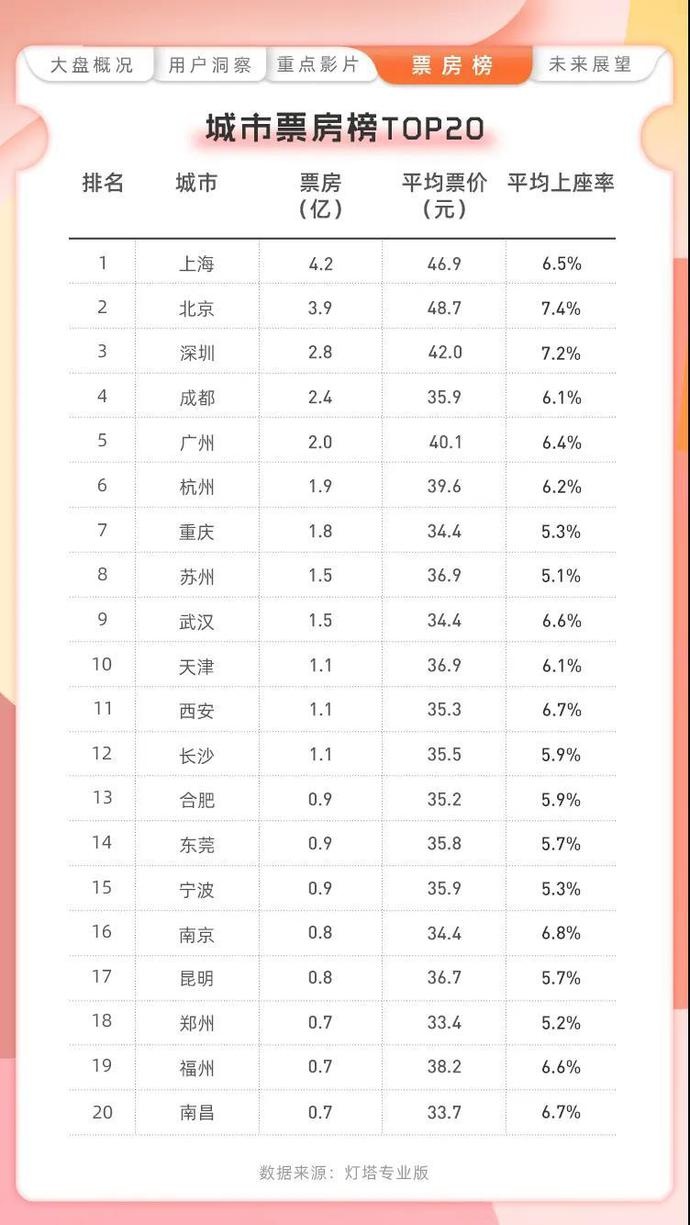 日前,灯塔电影实验室发布2021年暑期档中国电影市场洞察报告,今年暑期档,上海、北京、深圳三个一线城市分别位列城市票房榜的前三,同为一线城市的广州暑期票房总额被成都反超,排名榜单第五。