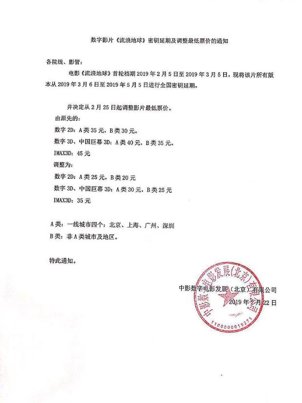 同时该片将从2月25日开始调整影片最低票价,调整后票价为数字2D版本:A类城市25元,B类城市20元,数字3D、中国巨幕3D:A类城市30元,B类城市25元,IMAX 3D最低票价35元。(A类城市为北京、上海、广州、深圳,B类城市为非A类城市。)
