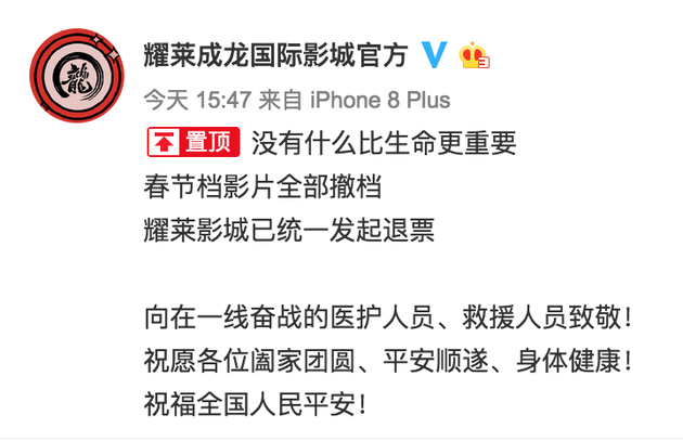 1月23日,春节档7部影片宣布全部撤档,耀莱成龙影城、金逸影城、时光网及IMAX等均发布退票或改签公告。