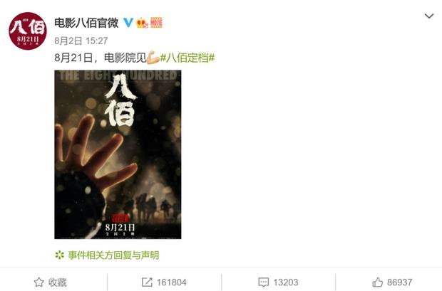 进入2020年,疫情的袭来让整个影视行业被迫停摆。直到今年7月,影院才开始陆续复工。8月2日,《八佰》官宣定档,成为影院复工后上映的首部大片。