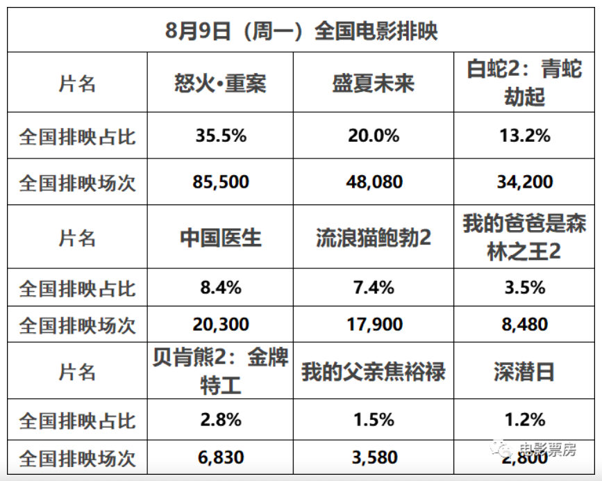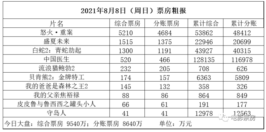 8月8日周日,全国共排映28.2万场,观影人次约245.5万,根据初步统计产出票房9540万。