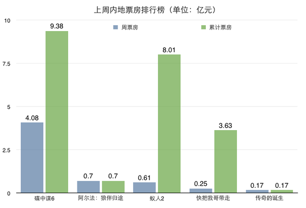 在几乎没有竞争对手的情况下,《碟中谍6》上周斩获票房4.08亿,占据大盘的59.6%,轻松蝉联周票房冠军。截止昨日,《碟中谍6》内地累计票房9.38亿,本周即将迈过10亿大关。