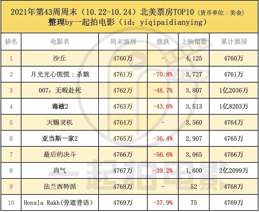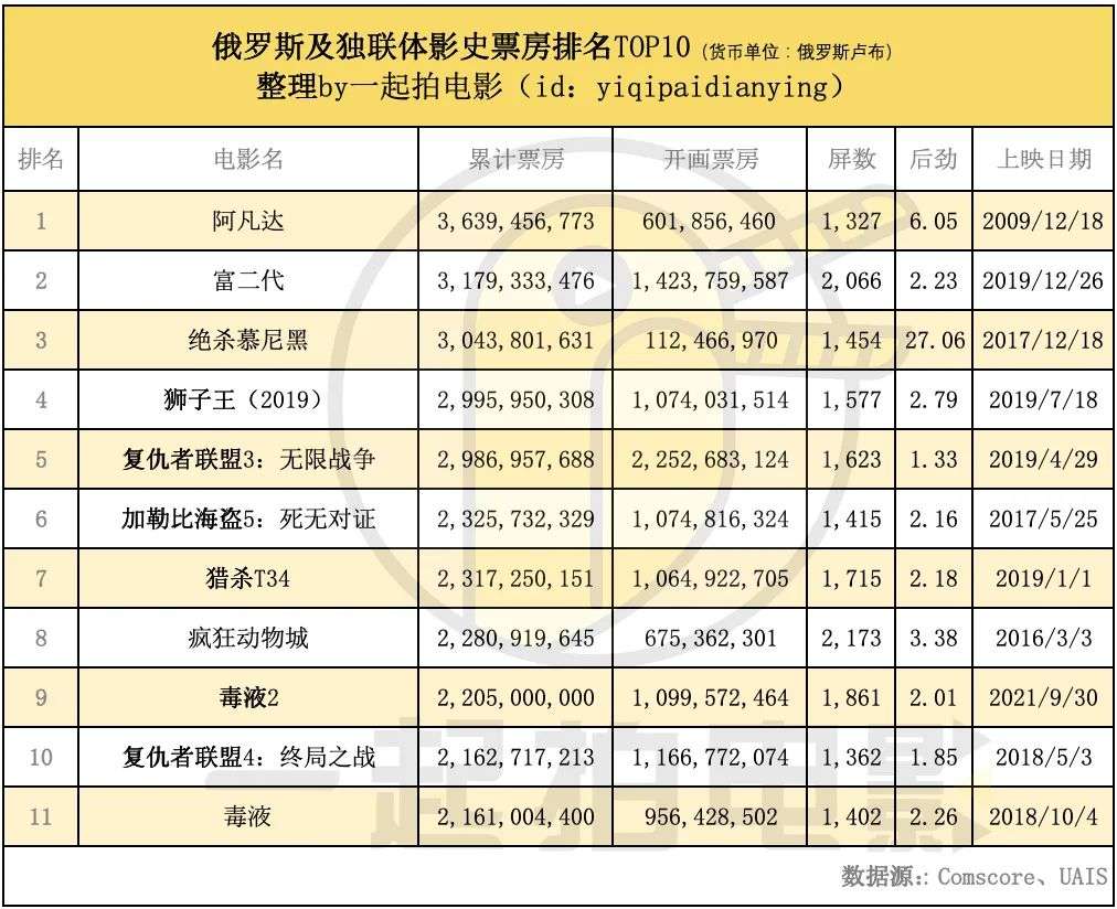 《毒液2》则拿下亚军,整体走势持平R级超英平均水准。海外方面在53个市场稳居31第一,同期领先疫情后所有好莱坞影片,目前不包括大陆全球票房将瞄准5亿美元。其中拉美市场在进入第三周后依然在10个市场中的9个保持冠军,累计票房达4590万美元。而截至上周末它在俄罗斯及独联体的累计票房达22亿卢比不仅超越了前作更顺利打进影史票房前十,最终来到第6名不成问题。