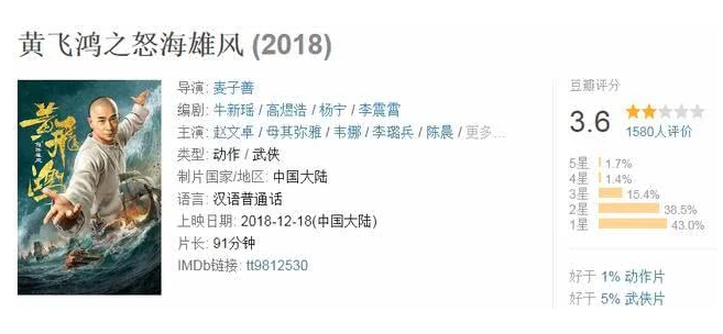 徐浩峰执导的《师父》口碑颇佳,总票房却仅有5478万;赵文卓主演的《黄飞鸿之南北英雄》、《黄飞鸿之怒海雄风》、《功夫联盟》等全部扑街,豆瓣全部在5分以下,让人不忍直视。