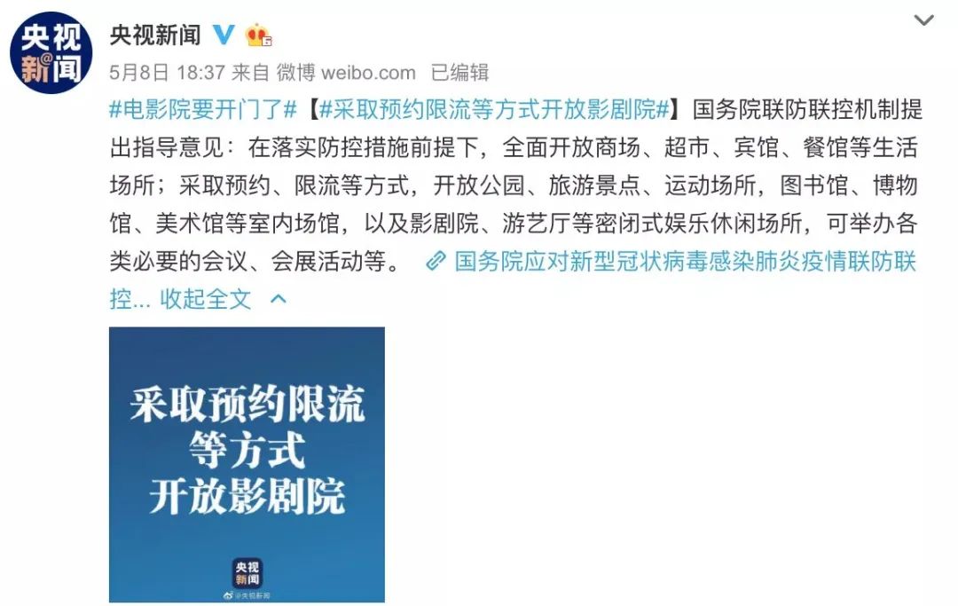 5月8日下午,国务院联防联控机制印发《关于做好新冠肺炎疫情常态化防控工作的指导意见》,其中在“重点场所防控”这一条,提到 “采取预约、限流等方式,开放公园、旅游景点、运动场所,图书馆、博物馆、美术馆等室内场馆,以及 影剧院、游艺厅等密闭式娱乐休闲场所,可举办各类必要的会议、会展活动等。”