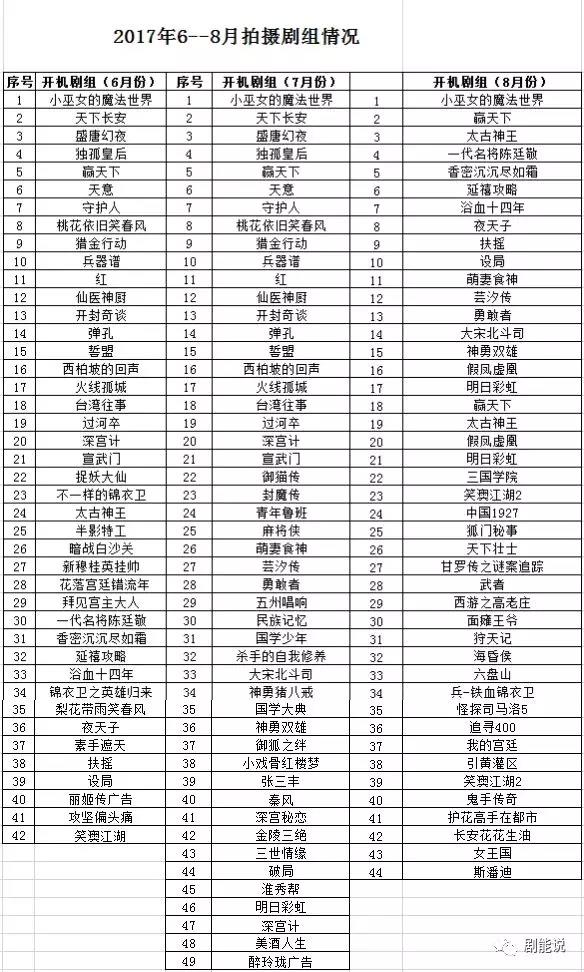 饶是如此,对比去年6-8月份横店有《香蜜沉沉烬如霜》《延禧攻略》《巴清传》《扶摇》《凤求凰》《朝歌》《芸汐传》《夜天子》《深宫计》《天下长安》《独孤皇后》等大古装剧在拍,前年同期有《大军师司马懿》《楚乔传》《择天记》《大唐荣耀》《远大前程》《独孤天下》《孤芳不自赏》《轩辕剑之汉之云》《射雕英雄传》《龙珠传奇》《柜中美人》,今年的横店剧组从数量到体量、咖位来看,确实弱势些。
