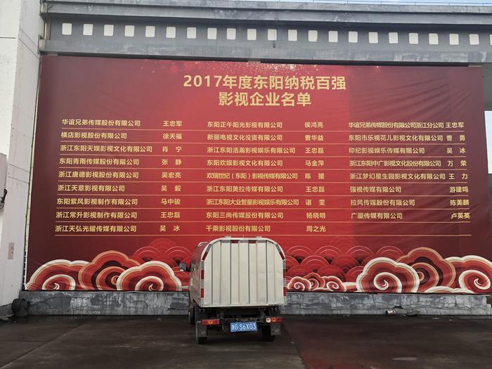 8月底,新浪娱乐实地探访横店影视产业实验区时看到,园区门口的一整面墙上,贴着红色的“2017年度东阳纳税百强影视企业名单”。