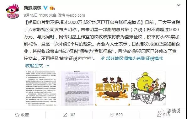 9月7日,有新闻爆料称,除了明星工作室税收税率从6%提高到42%外,政府口头传达要求各路明星10月份必须要补缴完税收,“政府的要求是,你先去补缴,到了10月底再抽查,所以现在明星艺人都在忙着去补税。”此爆料一出,“一、二线明星以及整个娱乐圈将面临大洗牌”等耸动标题扩散至全网。