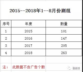 根据他们提供给新浪娱乐的数据,横店影视城2018年前8个月的剧组数量是263个,2017年同期是205个,2016年同期147个,2015年同期101个。(注:以上数据均不包含广告片)