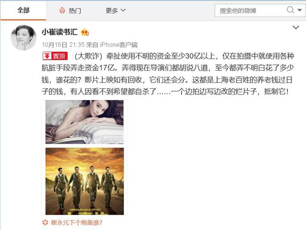 崔永元近日在微博中称,“(大欺诈)(意指《大轰炸》)牵扯使用不明的资金至少30亿以上,仅在拍摄中就使用各种肮脏手段弄走资金17亿。弄得现在导演们都胡说八道,至今都弄不明白花了多少钱,谁花的?影片上映如有回收,它们还会分。这都是上海老百姓的养老钱过日子的钱,有人因看不到希望都自杀了……一个边拍边写边改的烂片子,抵制它!”