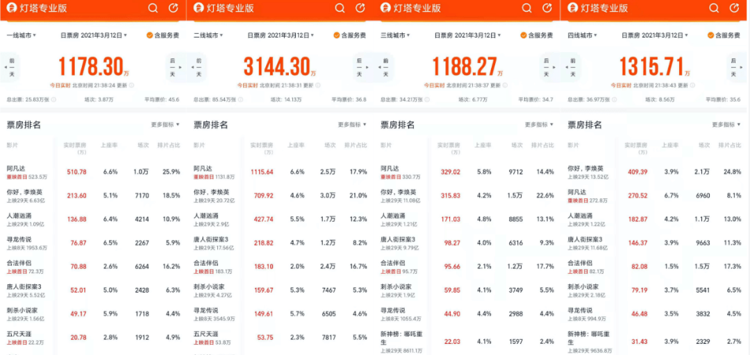 我们从今天大盘不同城市的市场占比也能看出,一二线城市《阿凡达》依旧有较高的票房号召力。但是到了三四线城市,《阿凡达》与《你好,李焕英》的差距不断减少,大多数四线城市因为没有收到拷贝,《你好,李焕英》的票房要比《阿凡达》高很多。甚至很多南方的三四线城市,《阿凡达》甚至一场排片都没有。