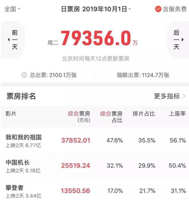 当前《我和我的祖国》、《中国机长》、《攀登者》三部电影,上映四天票房一路高歌,首日票房分别突破2.98亿、2.63亿、2.08亿,猫眼专业版预测,三部电影最终票房或将呈33.07亿、26.46亿、9.96亿梯队,总票房突破70亿人民币。