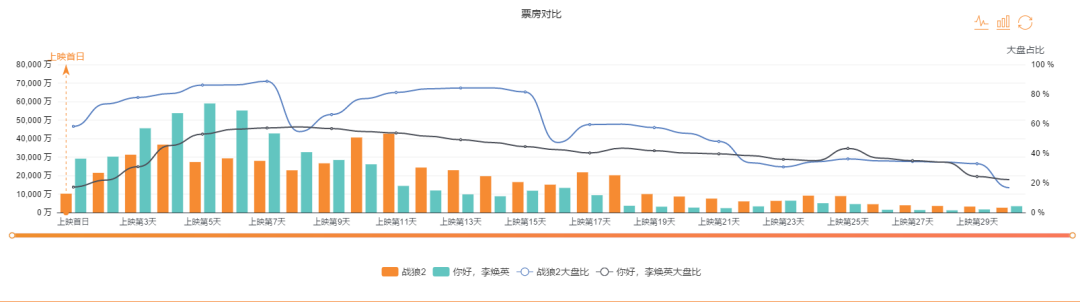 《战狼2》比《李焕英》长尾效应更加明显。以1亿票房为节点,《战狼2》与《李焕英》分别在上映第18日和第12日,日票房分别降至1亿以下,两者相差6天。