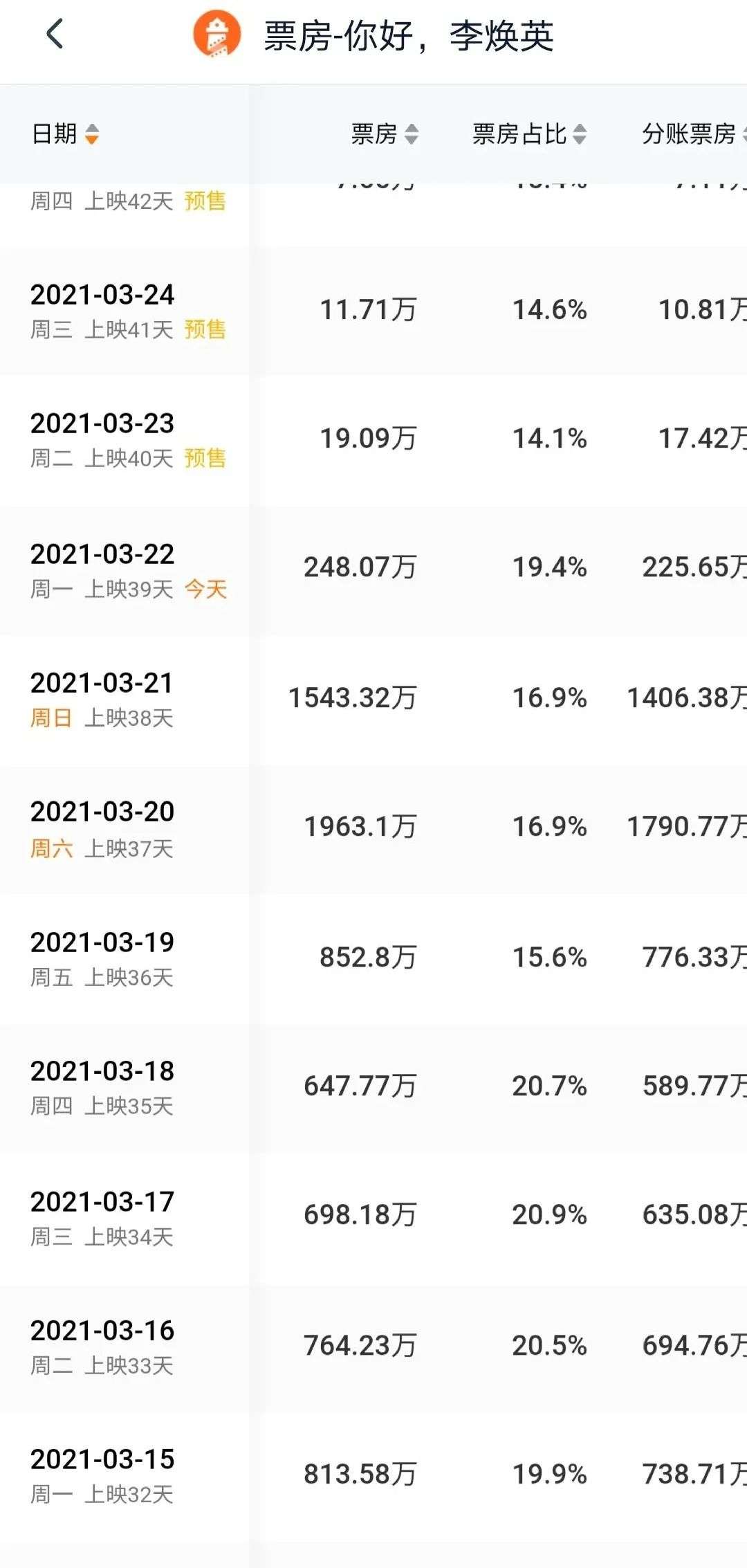但《李焕英》超越《战狼2》的可能性已经不大。以《李焕英》与《战狼2》的4亿票房差计算,《李焕英》若想超越《战狼2》,延期的一个月单日票房必须在1300万以上,而近一周《李焕英》日票房已经下降到千万以下。