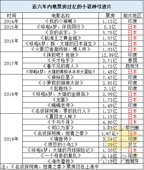 通过对比近六年内地票房过亿的小语种电影,可以看到日本以动画电影傍身,有哆啦A梦、柯南在手,不愁票房,后来者印度自《摔跤吧!爸爸》后,摸到了打开中国市场的门道,以关注本国社会矛盾为切口,形成了自己的品牌形象,近几年都保持着较为理想的票房表现,与日本分庭抗礼,成为内地电影市场的两股势力。