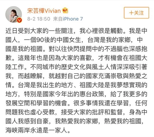 近日,电影《西虹市首富》主演、台湾演员宋芸桦被网友扒出曾在一段快问快答的视频中,称"最喜欢的国家是台湾"。很快,宋芸桦发布微博,表示"我是中国人,一个90后的中国女生,台湾是我的家乡,中国是我的祖国",并对以往快闪提问中的不过脑也深感抱歉。