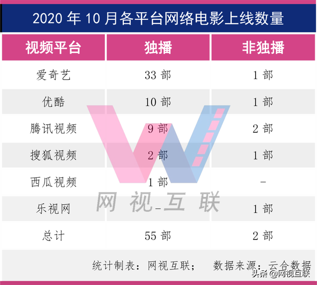 据云合数据,10月份各视频平台上线网络电影共计57部,其中,独播影片55部,非独播影片2部。