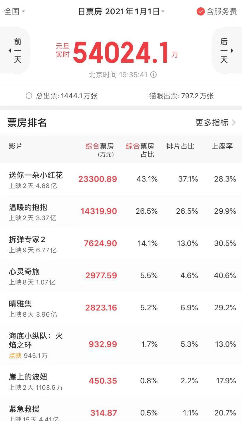 2020年最后一天,在压轴登场的两部影片《送你一朵小红花》(以下简称“《小红花》”)和《温暖的抱抱》(以下简称“《抱抱》”)的合力助攻下,贺岁档终于升温至沸点,推动单日大盘破5.3亿。1月1日以5.99亿刷新历年来元旦单日最高纪录。