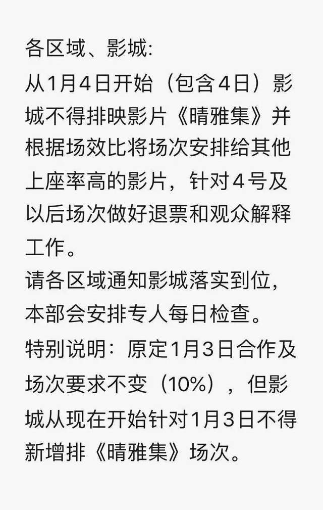 某院线的高管1月2日晚间在专资办的院线群中,收到了1月4日起停止放映《晴雅集》的通知,但领导并没有说明相关原因。这位高管甚至在考虑提前下映这部电影:“如果是我主导的排片,(1月3日)肯定就不排了。