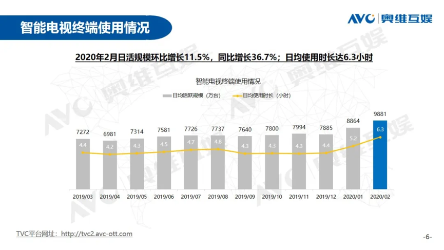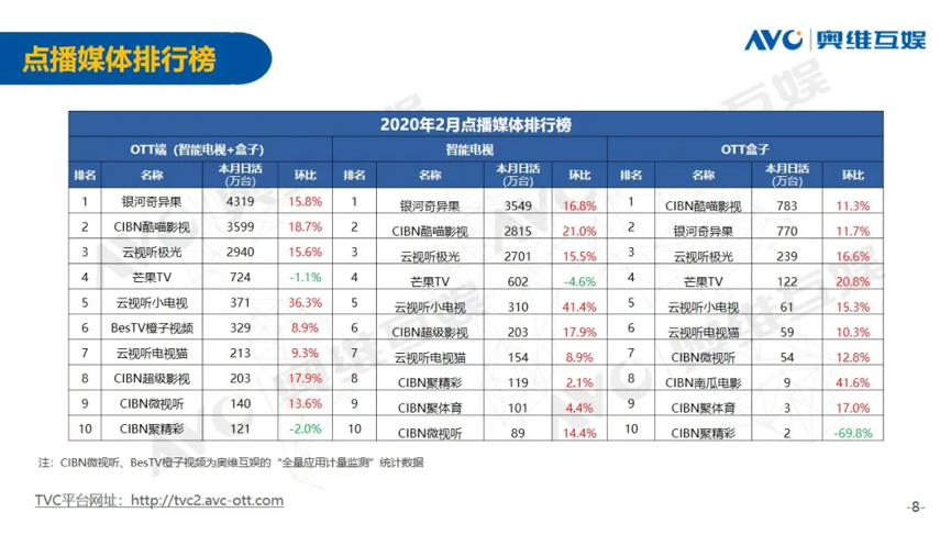 同时,随着OTT行业快速增长,疫情与春节叠加下的“客厅大屏”场景重要程度越来越高,从去年奥维互娱数据来看,整个2月OTT终端日开机率环比上升3.7个百分点,日均活跃终端数11395万台,环比上升10.5%,点播媒体TOP3的爱优腾均有15%以上的环比增长。