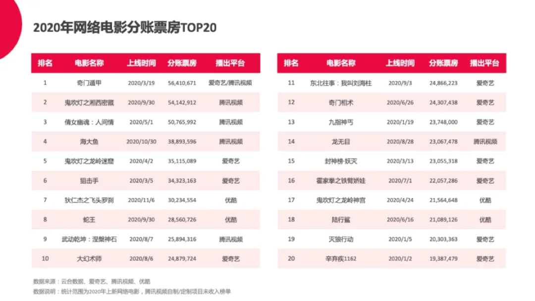 但疫情事发突然,时间紧迫,一时之间市场上优质电影内容供给显然有所不足,电影片方与平台的临时反应并未形成规模效应。从结果来看,当时的网络电影行业显然没做好准备——虽然各视频平台春节期间的网络电影排片有所增加,但2020年春节档排播的网络电影没有一部进入2020年分账榜TOP20,春节档分账破千万电影的数量还不如2019年。