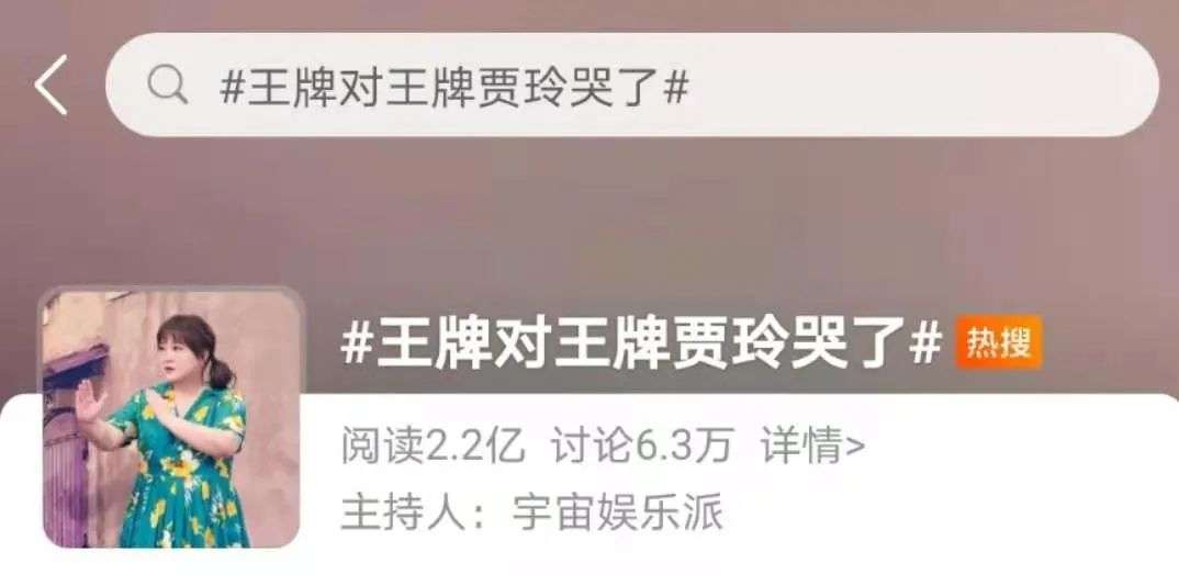 其中,在贾玲参与录制的一期《王牌对王牌》综艺中,微博上以#王牌对王牌贾玲哭了#为话题的热搜,阅读高达了2.1亿次。