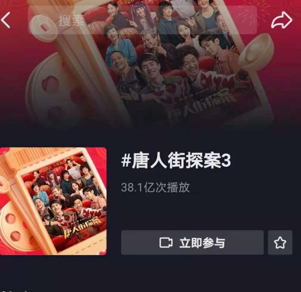 片方通过物料的路透,吸引了一波关注。新腕儿观察到,在抖音平台上,#唐人街探案3的相关视频内容,播放次数达到了37.6亿;#你好李焕英 播放次数为31.4亿;#刺杀小说家为16.3亿。