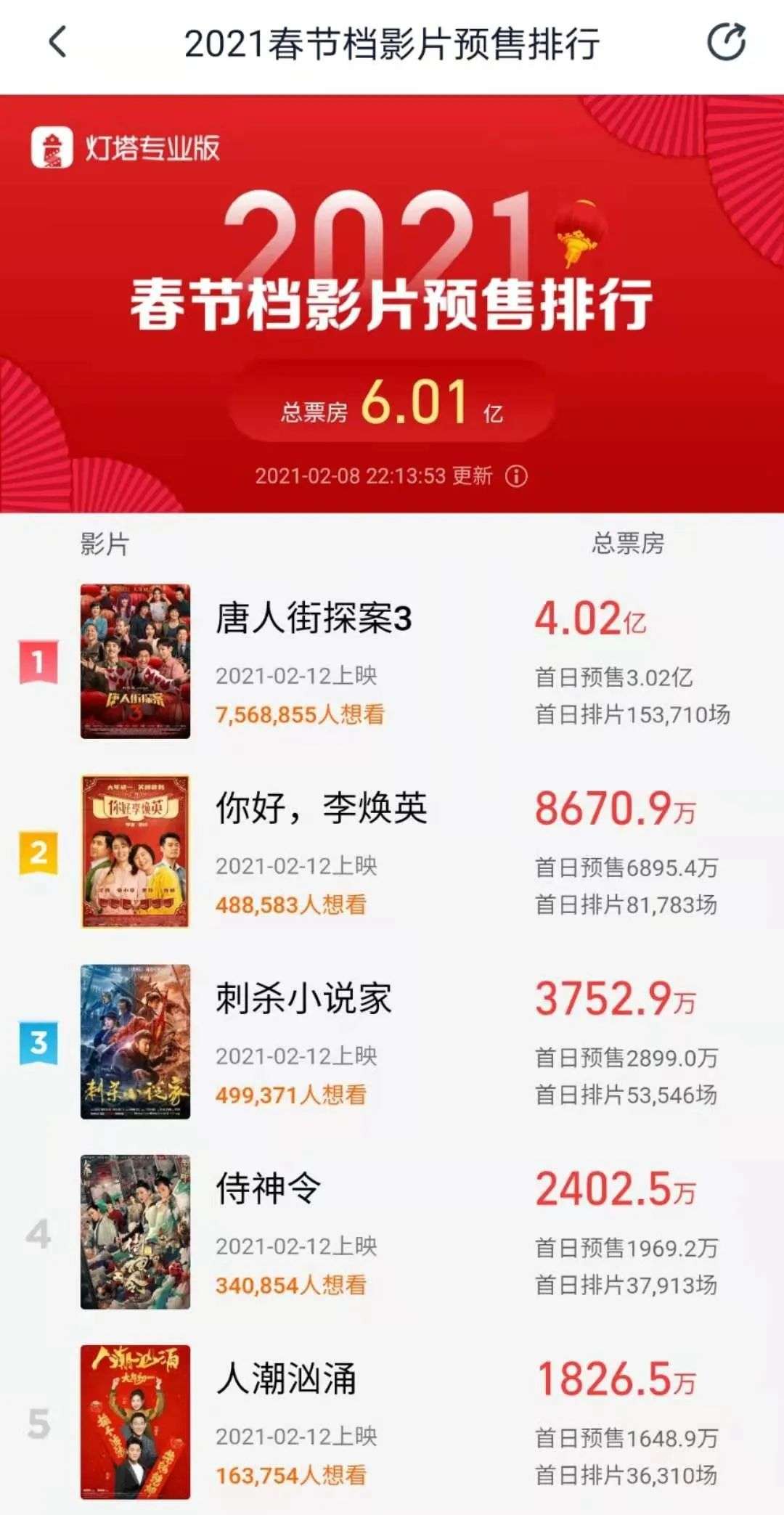 灯塔专业版数据显示,截至2月8日晚间,2021年春节档电影预售总票房突破6亿,《唐人街探案3》以4.02亿的成绩持续强势领跑,《你好,李焕英》为8670万,位列第二;《刺杀小说家》为3752万,位列第三。