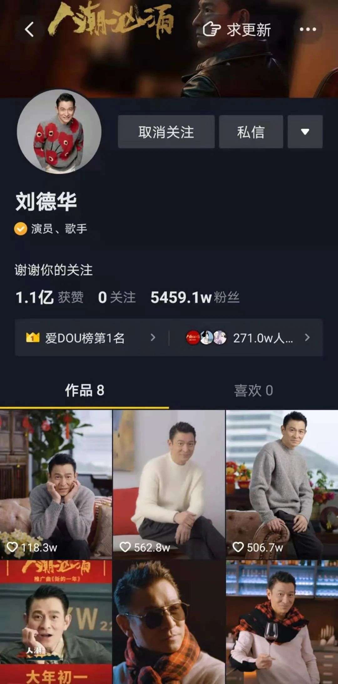 值得一提的是,为了宣传新电影《人潮汹涌》,天王刘德华在抖音平台开通了全球首个社交媒体账号。而开通账号不足一月共发布8个作品,便收获了5459万粉丝,可以说是现象级涨粉案例。不过刘德华的个人IP本身就自带巨量流量,短时间内暴涨5000万+粉合情合理。