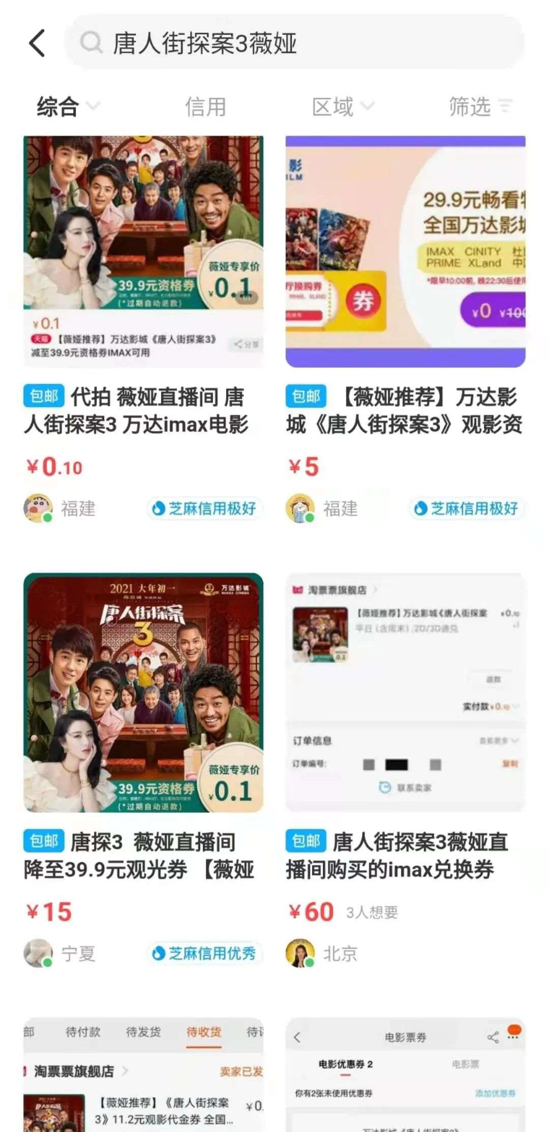 在一些二手交易平台上,随处可见,低价转薇娅直播间《唐探3》电影票的信息。