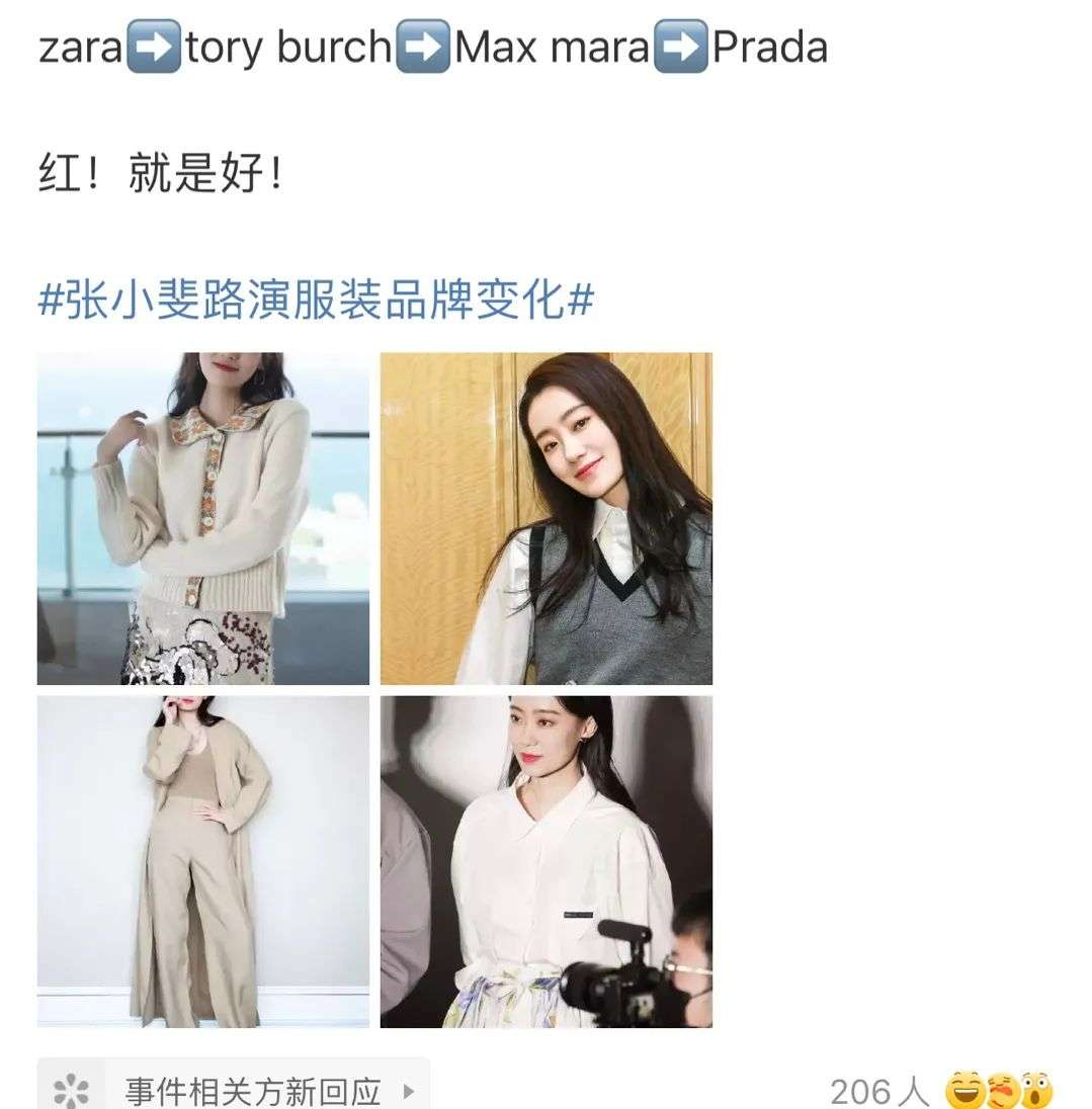 观众们津津乐道的另一个事例,是张小斐在进行《你好,李焕英》路演时服装的变化。第一次路演时她穿着几百块的zara快消,之后改换成轻奢品牌Tory Burch,再到《我的前半生》中唐晶常穿的Max mara,最后到蓝血奢侈品Prada,总共只用了五天时间。