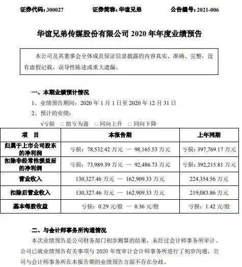 首先目前对于影视娱乐第一股华谊兄弟来说一点也不友好,其已经在2018年、2019年分别亏损10.93亿元、亏损39.6亿元,2020年业绩快报显示又将巨亏7.85-9.8亿元之间,三年累计亏损超过接近60亿元,相当于华谊现在市值的一半。