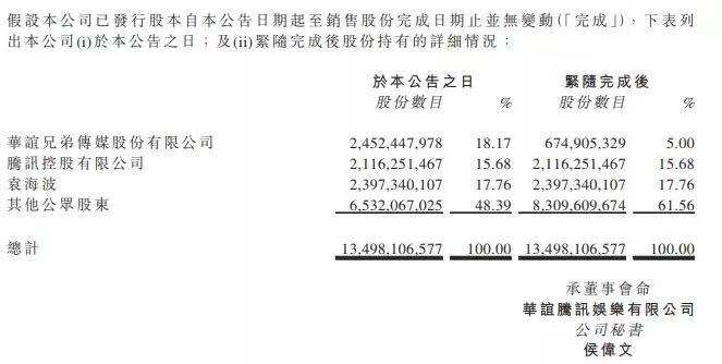 这家公司最大的股东当然是华谊,完成借壳后持股比例为18.17%,因此王中军是这家港股上市公司背后真正的操盘手;腾讯系持股15.68%,为第二大股东,原来阿里系持股5%,后来的持股数据还不详。